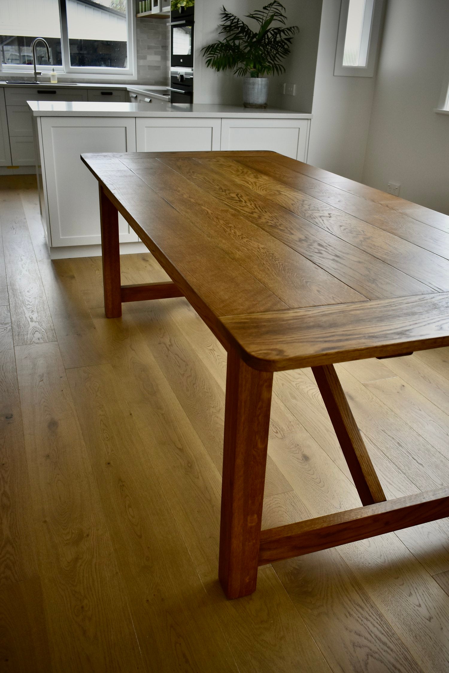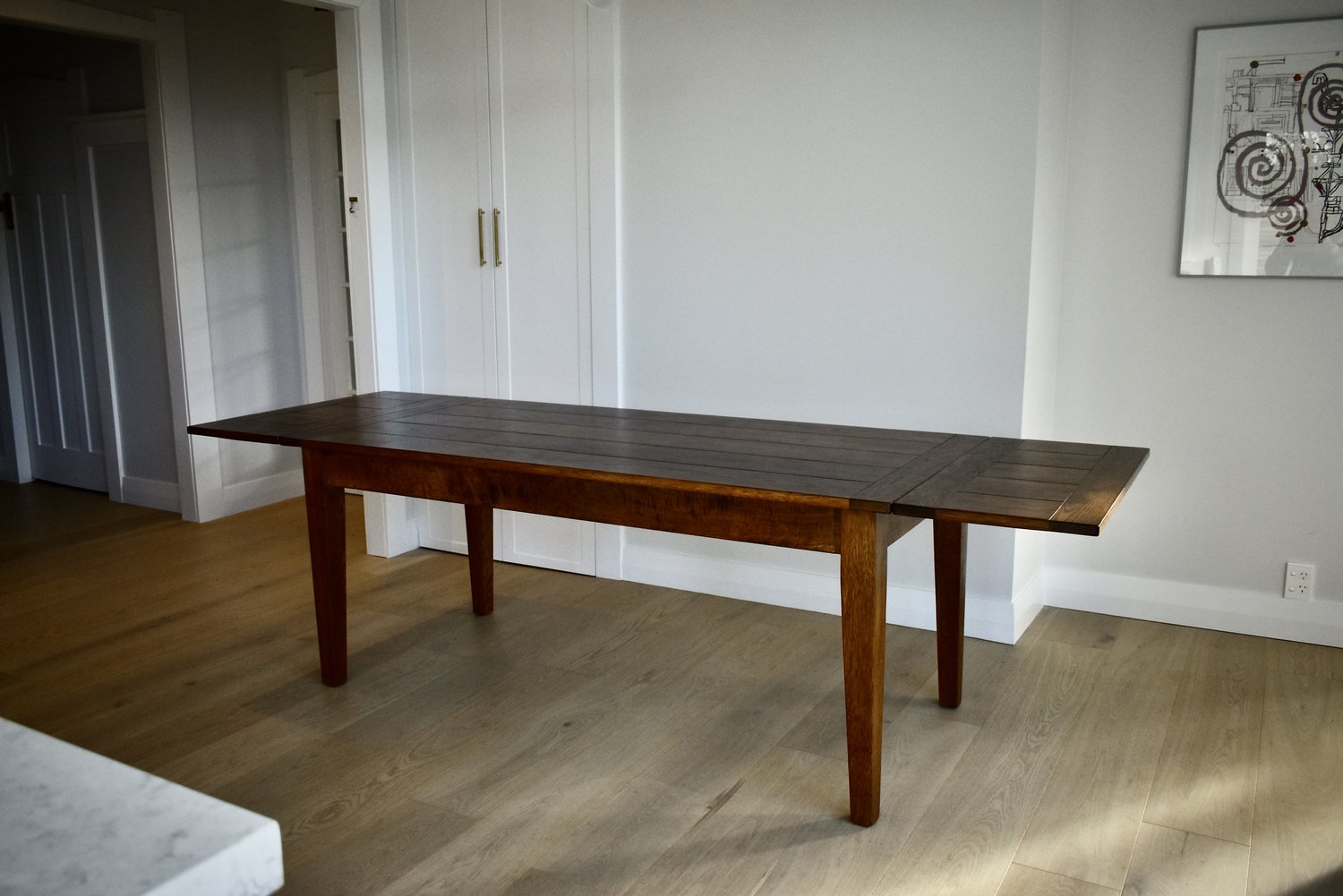 A commissioned family table with extensions 400 deep to seat eight. Read more about Projects By Rene from the link at the top of the page.